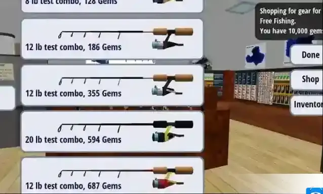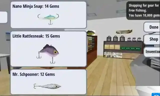 3、选好地点后需要去购买装备,点击shop按钮来购买不同的钓鱼装备。