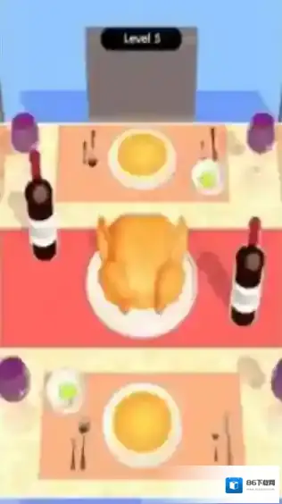 2、画面呈现摆放烤火鸡、餐盘、酒杯、餐具等的餐桌场景,属于休闲益智,玩法围绕按要求布置餐桌、摆放餐食等展开,烤火鸡是西餐常见主菜,常出现在这类模拟布置。
