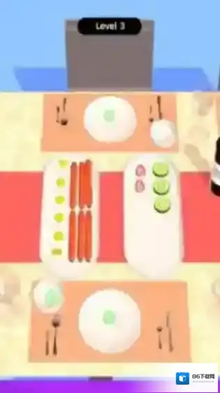 1、显示“Level3”(等级3),画面呈现餐桌场景,有餐盘、鸡蛋、香肠、猕猴桃等食材摆盘,属于休闲益智类,玩法是按要求完成餐桌布置、食材摆放等任务。