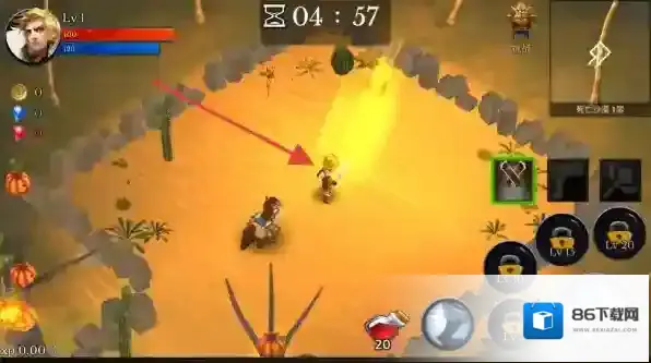 3、利用虚拟按键操控角色移动、攻击,靠近怪物触发战斗,通过技能释放击败敌人,积累经验,推进沙漠冒险。