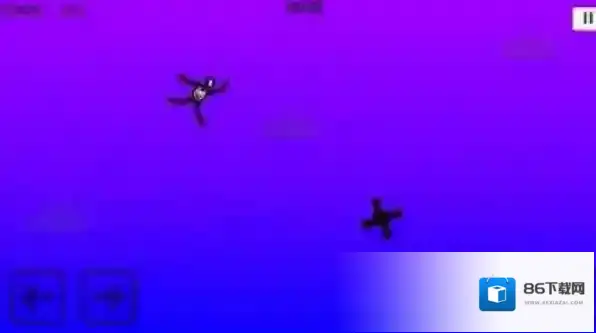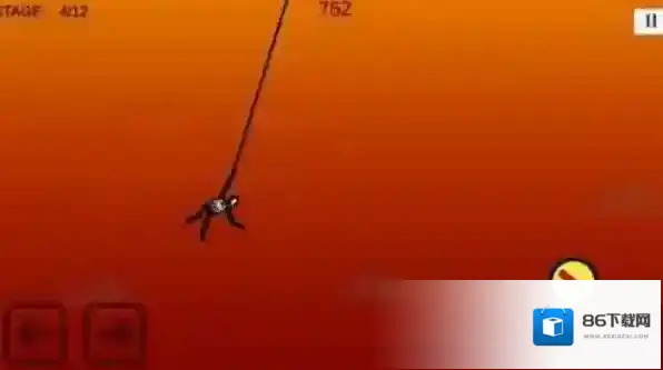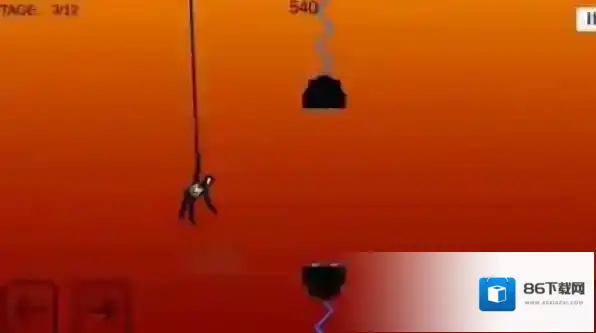 2、操控火柴人,点击右侧方块按钮,释放/收回蜘蛛丝,让角色在场景中摆动,跨越障碍,注意把控点击节奏,保持角色移动轨迹。