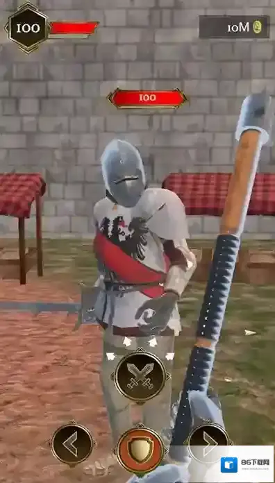 3、画面中有身着盔甲的骑士角色,界面左上角和上方显示血量数值100,下方有攻击、盾牌防御、方向移动等操作按钮,背景能看到石墙、带格子桌布的桌子等场景元素。