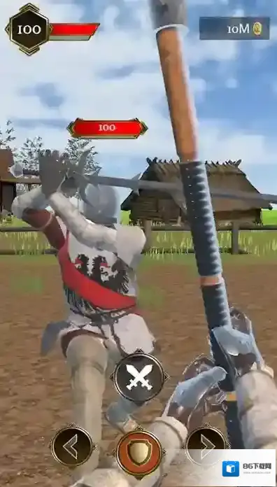 2、画面中显示两名身着盔甲的骑士在对战,上方显示双方血量均为100,下方有操作按钮,包括攻击(交叉剑图标)、盾牌防御(盾牌图标)以及方向移动按钮。