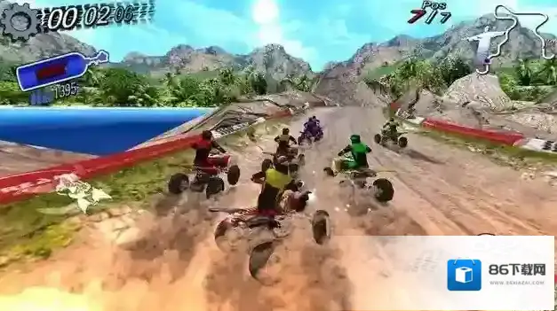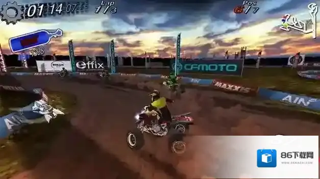 2、在“CAREER”模式,驾驶蓝白ATV,沿越野赛道,避障碍、超对手,积累比赛经验。