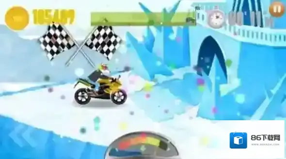 3、在新场景(如冰岛赛道),留意速度表、计时,稳控摩托过障碍,冲线通关,积累金币解锁新车、关卡。