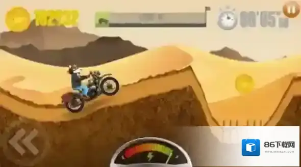 1、进入游戏,操控骑摩托的角色在沙漠地形(LEVEL01)行驶,借左右按键控平衡,过起伏地形,收集金币。