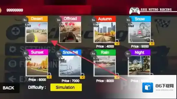 1、多环境赛道设计:包含荒漠峡谷、未来都市、雪山冰原等10种风格迥异的赛道,每条赛道设置不同的地形障碍与氮气加速带,要求玩家根据环境调整驾驶策略。