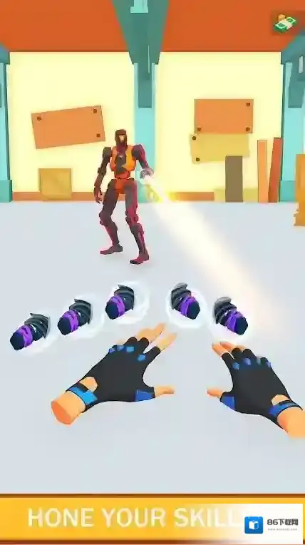 1、画面中下方有双手操控技能释放的互动操作,上方有个身着战斗服饰的角色,底部文字“HONEYOURSKILLS”意为“磨练你的技能”。