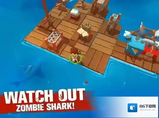 2、屏幕左下角的虚拟摇杆可控制角色移动,操控角色在木筏上及周围水域移动,收集漂浮的资源(如木板)。