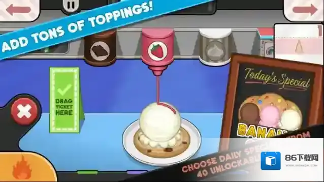 7、当你完成制作后,将右上角的菜单拖动到菜单牌上,这样顾客就可以看到他们点的冰淇淋了。顾客会根据冰淇淋的质量打分,并给予小费作为奖励。