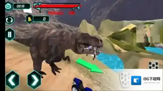 3、驾驶时用左右箭头控方向,踏板控速度,沿箭头冲坡,避恐龙、障碍,完成越野。